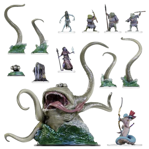 This expansion set is a companion to the Dungeons & Dragons: Onslaught Harpers vs. Zhentarim core set, featuring stunning monster miniatures, a new double-sided game board, and eight sinister scenarios designed to freeze your blood and test your tactical acumen. Fight your way to the frightening Froghemoth, with removable tentacles and eyestalks that let you switch between underwater and above water versions! It also features a new deck of item cards to swap with the core set item cards, providing new abilities, and adding the danger of cursed items!