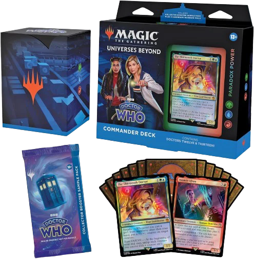 Doctor Who meets Magic: The Gathering in the latest Universes Beyond crossover! Exterminate your foes with any of the 4 Doctor themed Commander decks: Masters of Evil, Blast from the Past, Timey-Wimey, and Paradox Power. Each Commander deck contains: