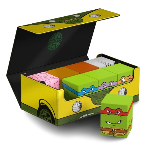 The perfect storage box for multiple TCG decks, trading cards, and of course your Squaroes collection: The "Turtle Van" Collectors Case from the Teenage Mutant Ninja Turtles™ edition is the ideal home for up to eight Squaroes boxes, individual trading cards (up to 1000 in double protective sleeves), or gaming accessories of all kinds. The full-color printed, durable Xenoskin material and the strong magnetic closure with ZnapClaw mechanism ensure that all contents are kept safe.